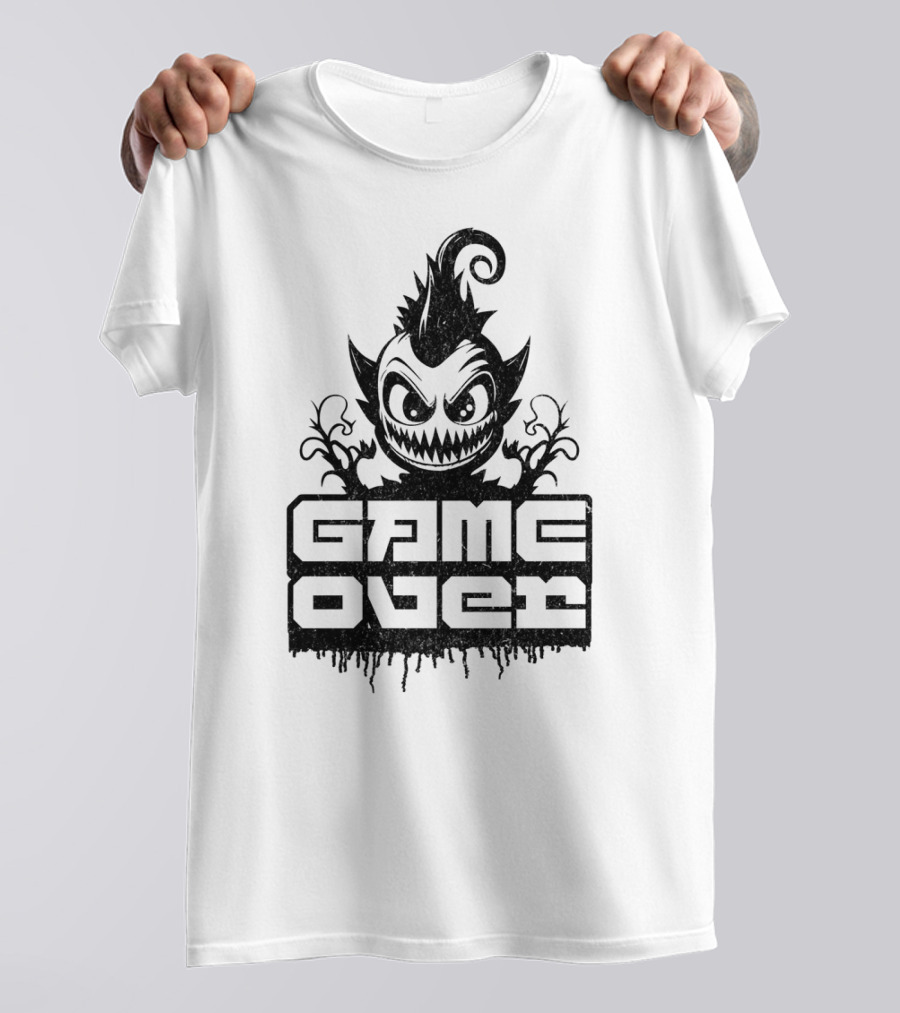 GAME OVER Creepy Monster Icon with Sharp Teeth and Spiky Hair Shirt made from 100% pre-shrunk ring-spun cotton, unisex regular fit based on U.S. standard sizing. The shirt is designed, cut, sewn, and printed in the United States. Available in sizes S-5XL.