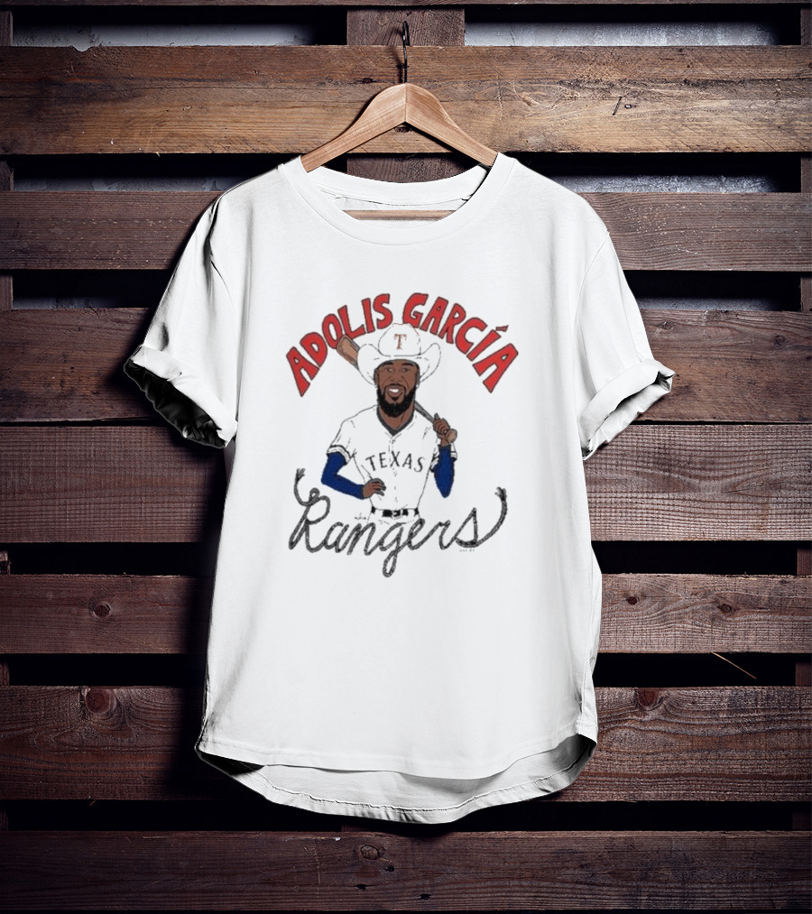 Adolis García Texas Rangers Cowboy Caricature Player Shirt made from 100% pre-shrunk ring-spun cotton, unisex regular fit based on U.S. standard sizing. The shirt is designed, cut, sewn, and printed in the United States. Available in sizes S-5XL.