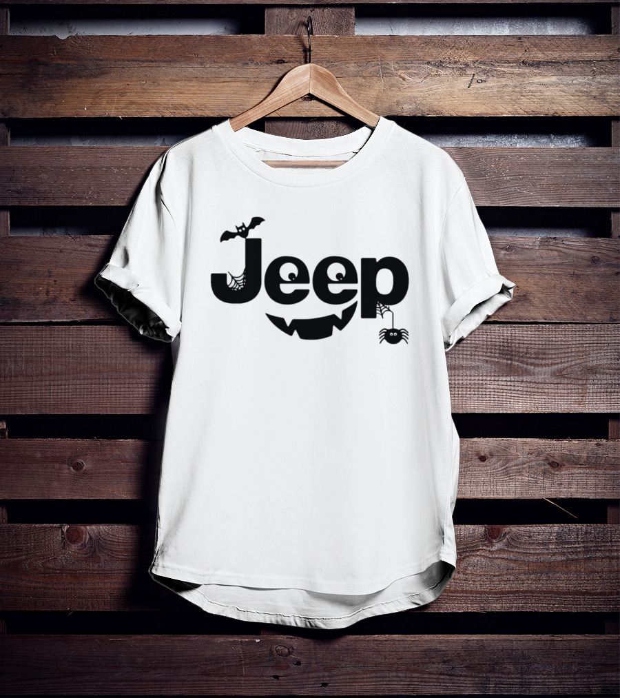 Halloween Jeep Logo with Bat, Spider, and Web Elements Shirt made from 100% pre-shrunk ring-spun cotton, unisex regular fit based on U.S. standard sizing. The shirt is designed, cut, sewn, and printed in the United States. Available in sizes S-5XL.