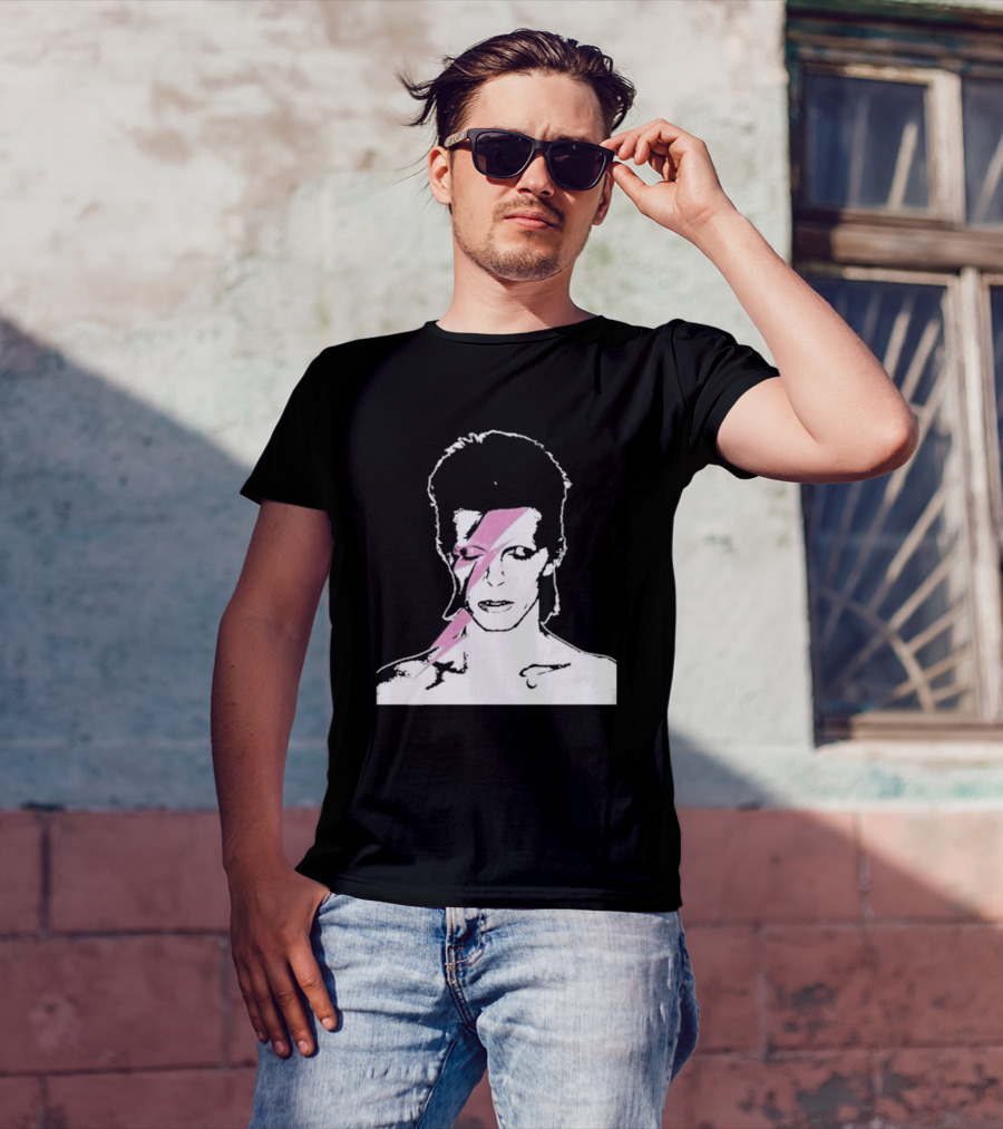 Ziggy Stardust Pink Lightning Bolt Iconic Tribute Carrie Bradshaw Connection Shirt made from 100% pre-shrunk ring-spun cotton, unisex regular fit based on U.S. standard sizing. The shirt is designed, cut, sewn, and printed in the United States. Available in sizes S-5XL.