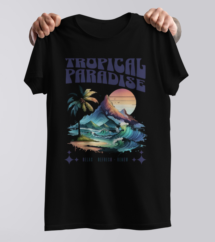 Tropical Paradise Palm Waves Island Horizon Sunset Shirt made from 100% pre-shrunk ring-spun cotton, unisex regular fit based on U.S. standard sizing. The shirt is designed, cut, sewn, and printed in the United States. Available in sizes S-5XL.