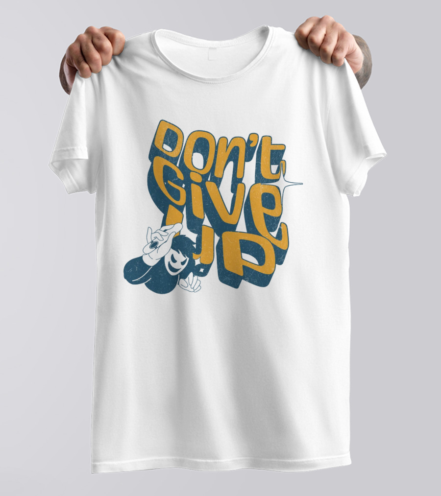 DON'T GIVE UP Retro Cartoon Hand Gesture Text Shirt made from 100% pre-shrunk ring-spun cotton, unisex regular fit based on U.S. standard sizing. The shirt is designed, cut, sewn, and printed in the United States. Available in sizes S-5XL.