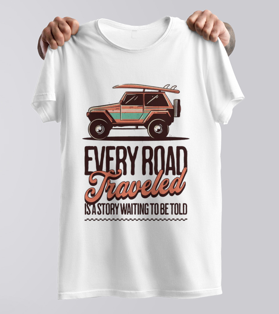 Every Road Traveled Is a Story Waiting to Be Told Green and Orang Traveling Quotes Typography Jeep Shirt made from 100% pre-shrunk ring-spun cotton, unisex regular fit based on U.S. standard sizing. The shirt is designed, cut, sewn, and printed in the United States. Available in sizes S-5XL.