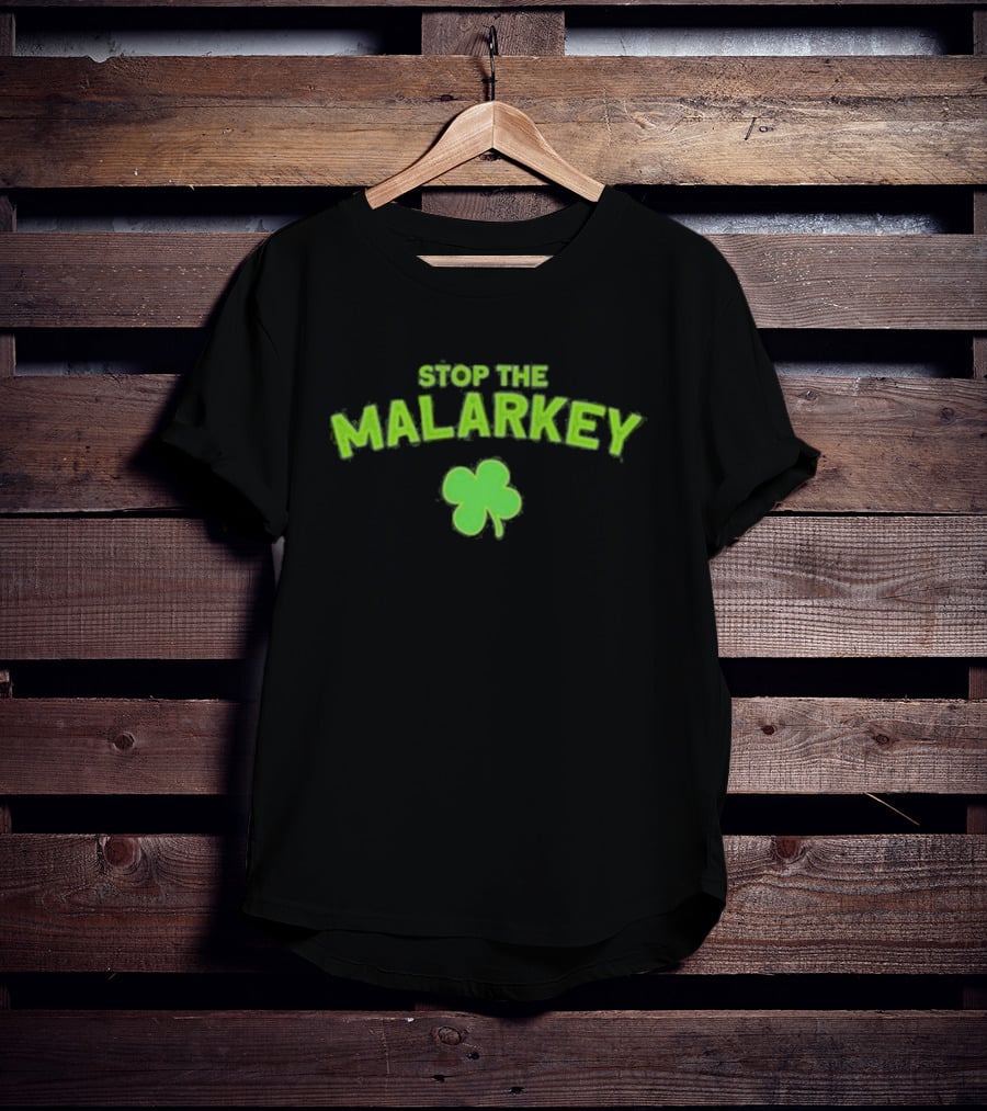 Stop The Malarkey Green Clover Shirt made from 100% pre-shrunk ring-spun cotton, unisex regular fit based on U.S. standard sizing. The shirt is designed, cut, sewn, and printed in the United States. Available in sizes S-5XL.
