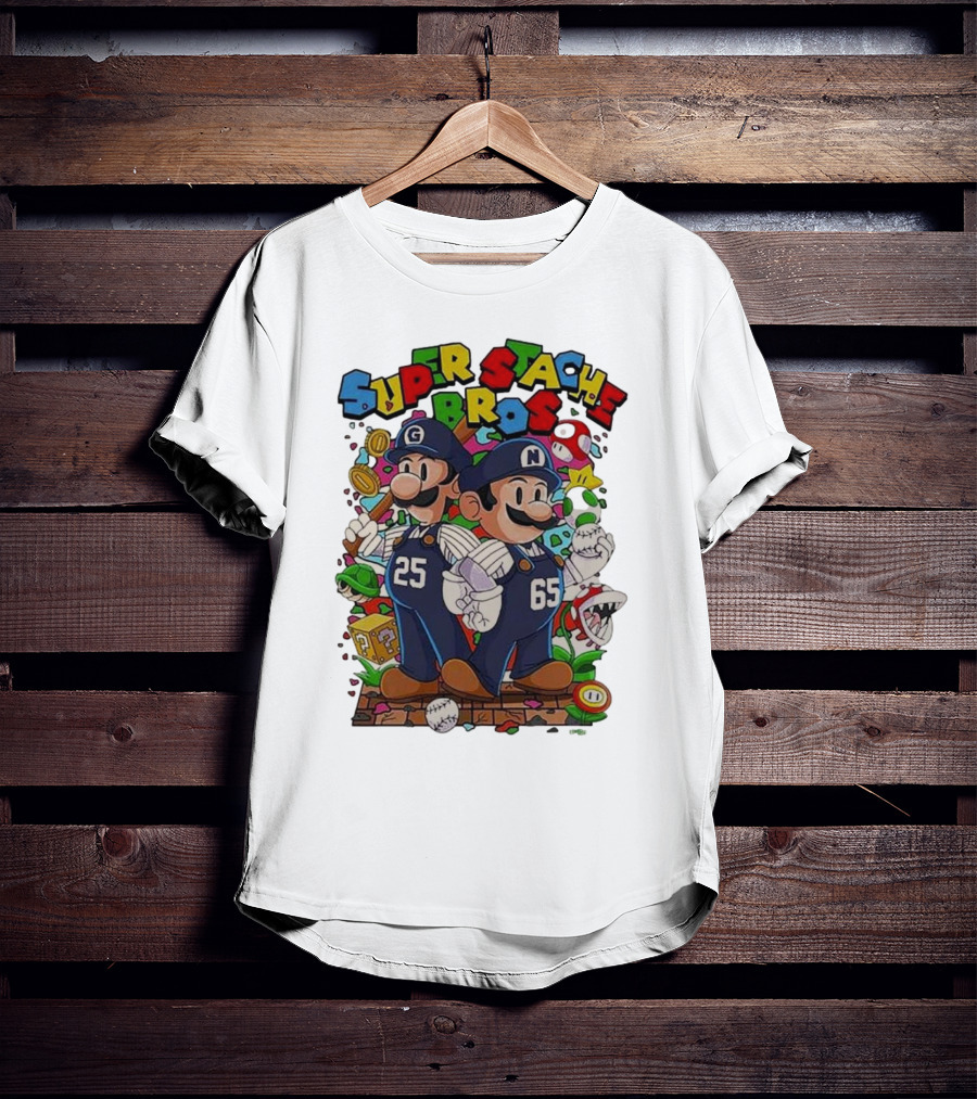Super Stache Bros Numbers 25 and 65 Baseball Mario Shirt made from 100% pre-shrunk ring-spun cotton, unisex regular fit based on U.S. standard sizing. The shirt is designed, cut, sewn, and printed in the United States. Available in sizes S-5XL.