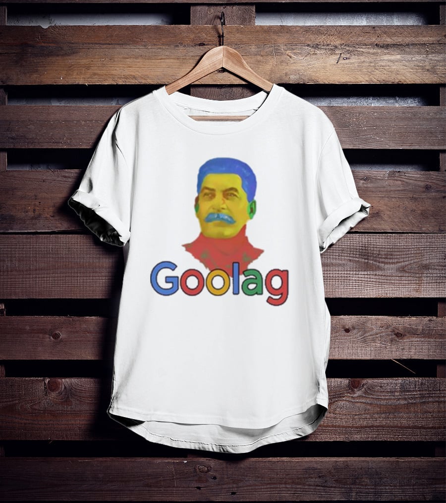 Goolag Stalin Google Shirt made from 100% pre-shrunk ring-spun cotton, unisex regular fit based on U.S. standard sizing. The shirt is designed, cut, sewn, and printed in the United States. Available in sizes S-5XL.