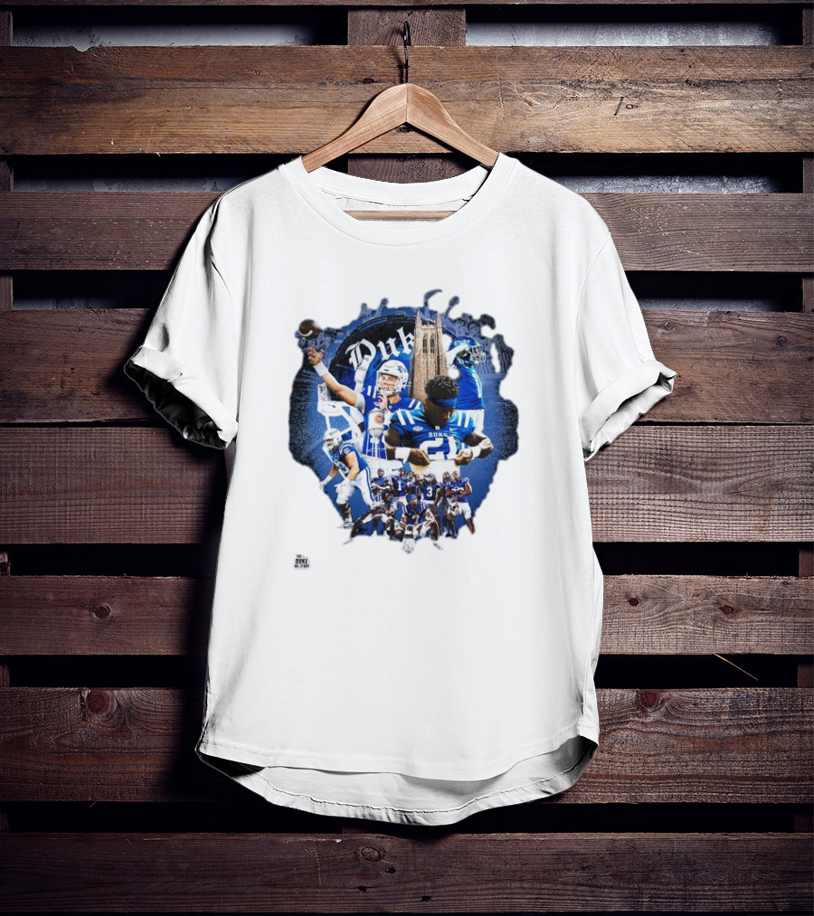 Duke Football Team Celebration Images Tower Shirt made from 100% pre-shrunk ring-spun cotton, unisex regular fit based on U.S. standard sizing. The shirt is designed, cut, sewn, and printed in the United States. Available in sizes S-5XL.