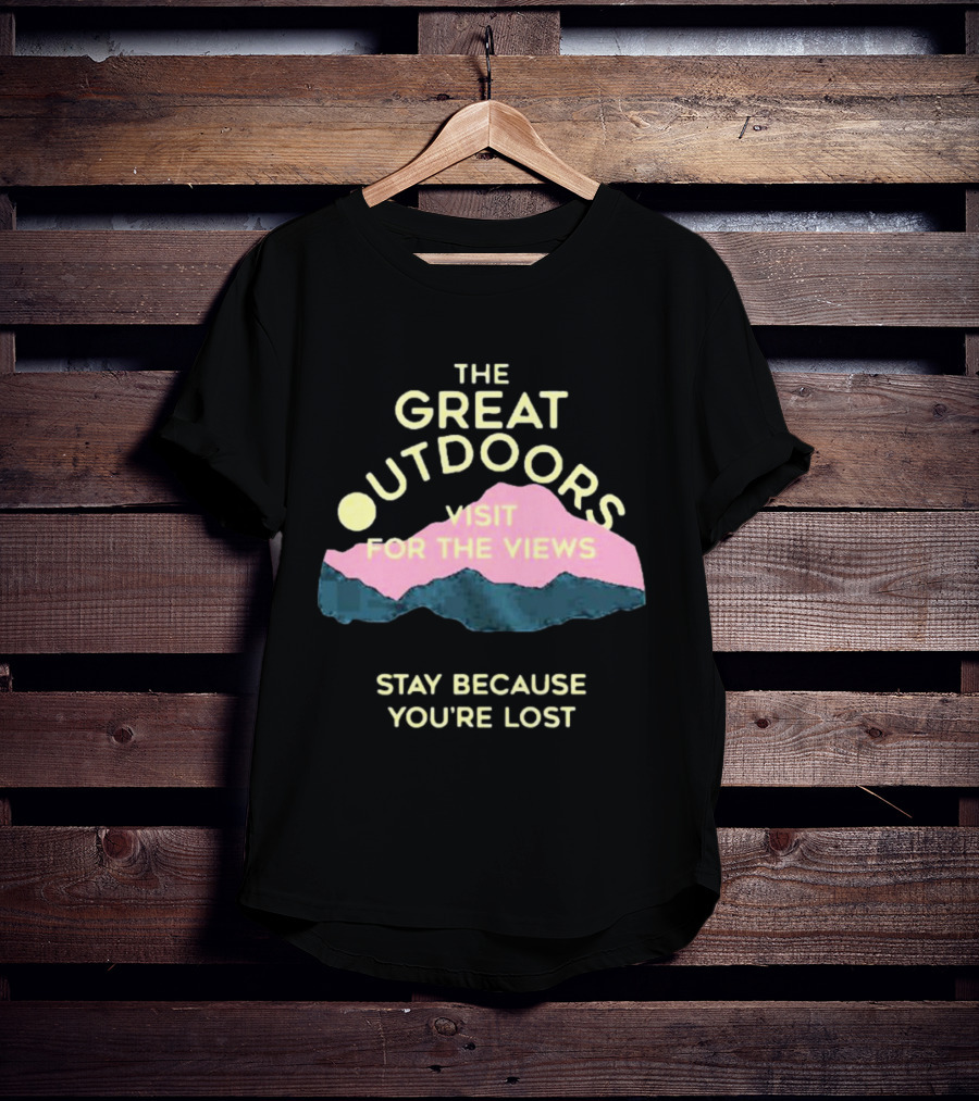 The Great Outdoors Visit For The Views Stay Because You’re Lost Adventure Mountain Scenery Shirt made from 100% pre-shrunk ring-spun cotton, unisex regular fit based on U.S. standard sizing. The shirt is designed, cut, sewn, and printed in the United States. Available in sizes S-5XL.