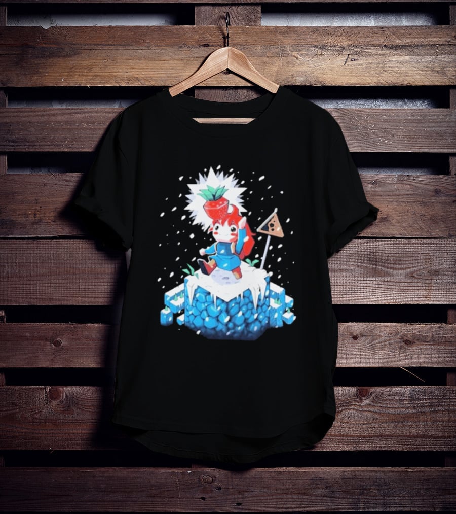 The Yetee Celeste 64 Pixel Adventure Character With Strawberry And Flag On Ice Mountain T-Shirt