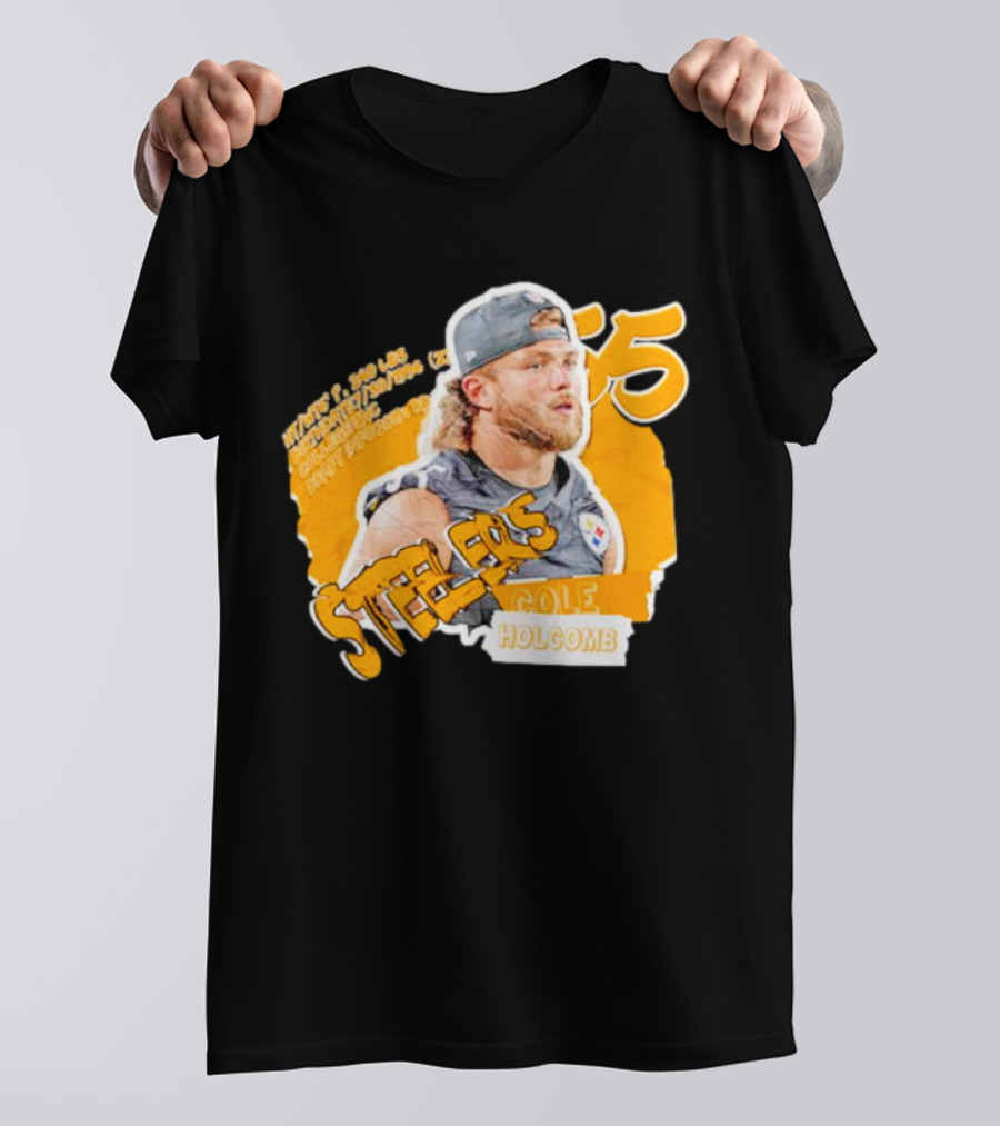 Steelers Football Cole Holcomb 55 Weight 240 lbs Height 6'1 Shirt made from 100% pre-shrunk ring-spun cotton, unisex regular fit based on U.S. standard sizing. The shirt is designed, cut, sewn, and printed in the United States. Available in sizes S-5XL.