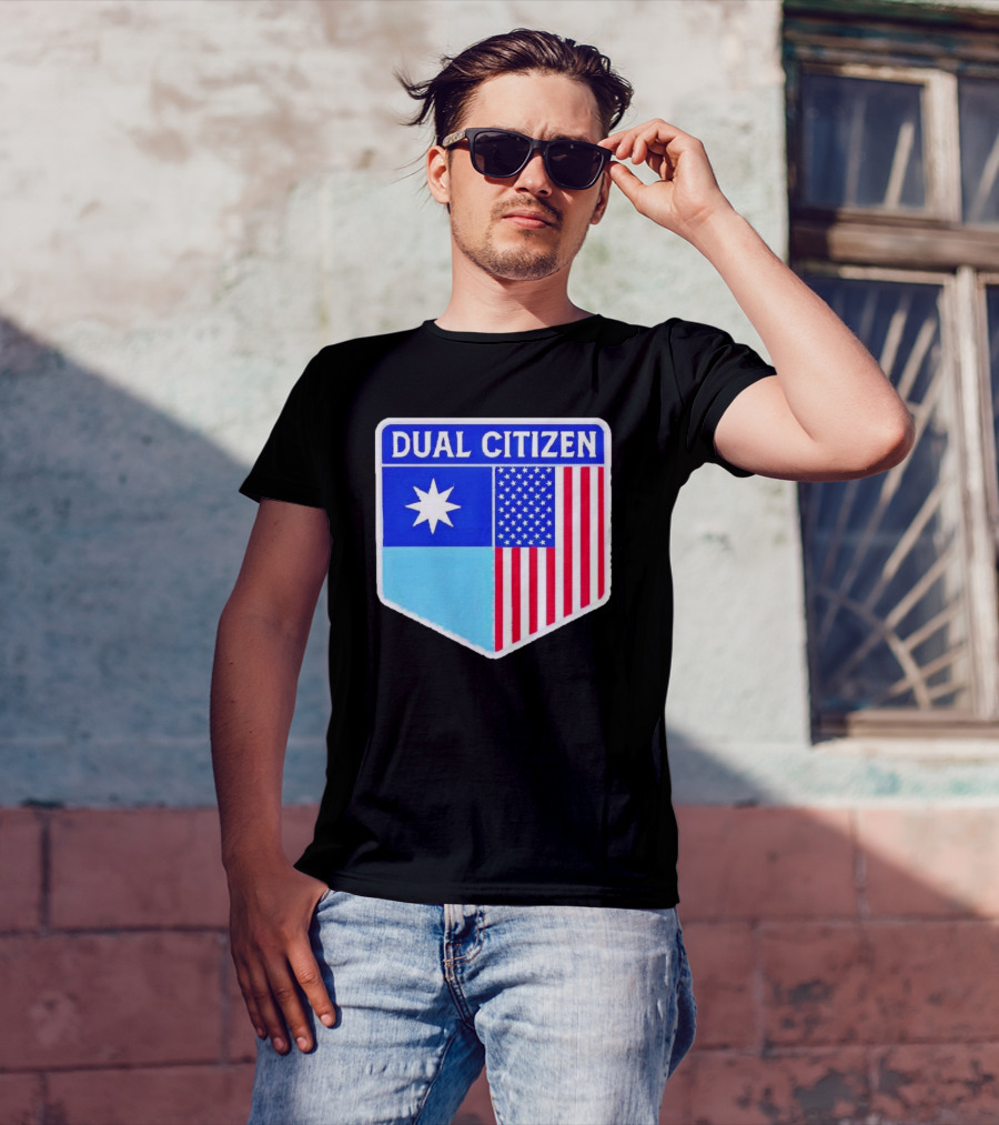 Dual Citizen of Minnesota and USA Flag Badge Shirt made from 100% pre-shrunk ring-spun cotton, unisex regular fit based on U.S. standard sizing. The shirt is designed, cut, sewn, and printed in the United States. Available in sizes S-5XL.