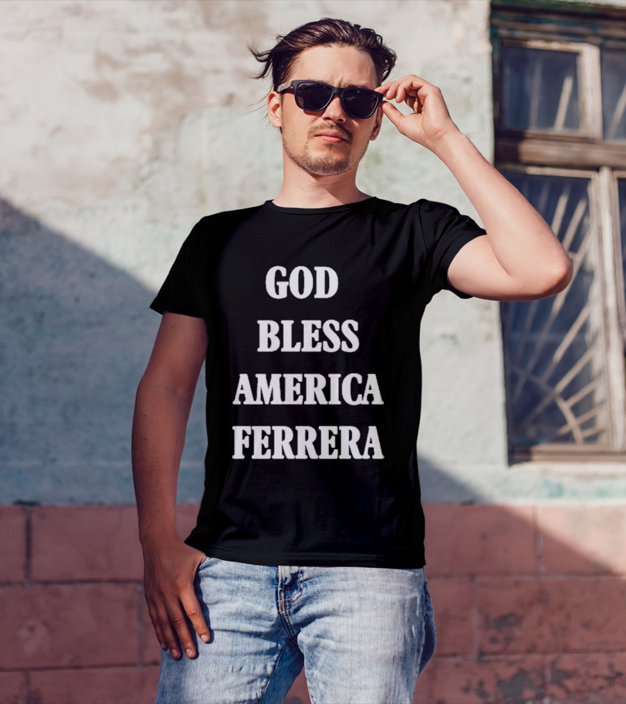 God Bless America Ferrera Shirt made from 100% pre-shrunk ring-spun cotton, unisex regular fit based on U.S. standard sizing. The shirt is designed, cut, sewn, and printed in the United States. Available in sizes S-5XL.