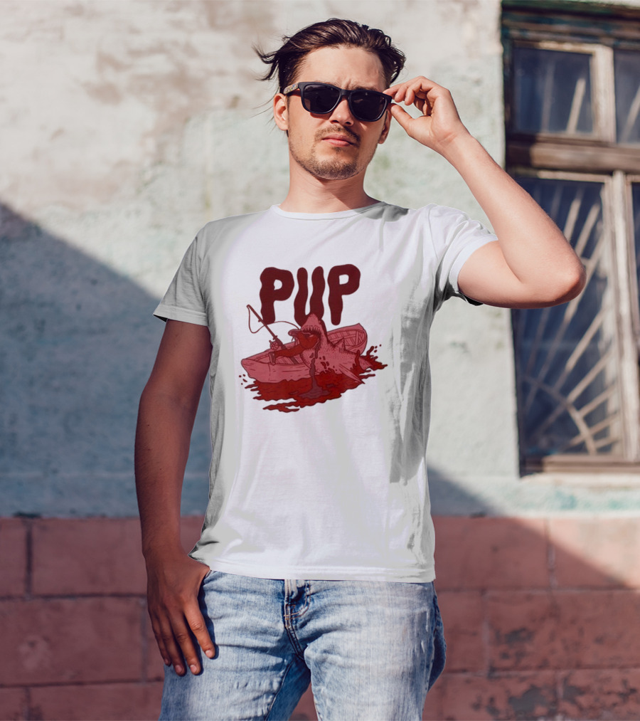 PUP Shark Attack Boat Shirt made from 100% pre-shrunk ring-spun cotton, unisex regular fit based on U.S. standard sizing. The shirt is designed, cut, sewn, and printed in the United States. Available in sizes S-5XL.