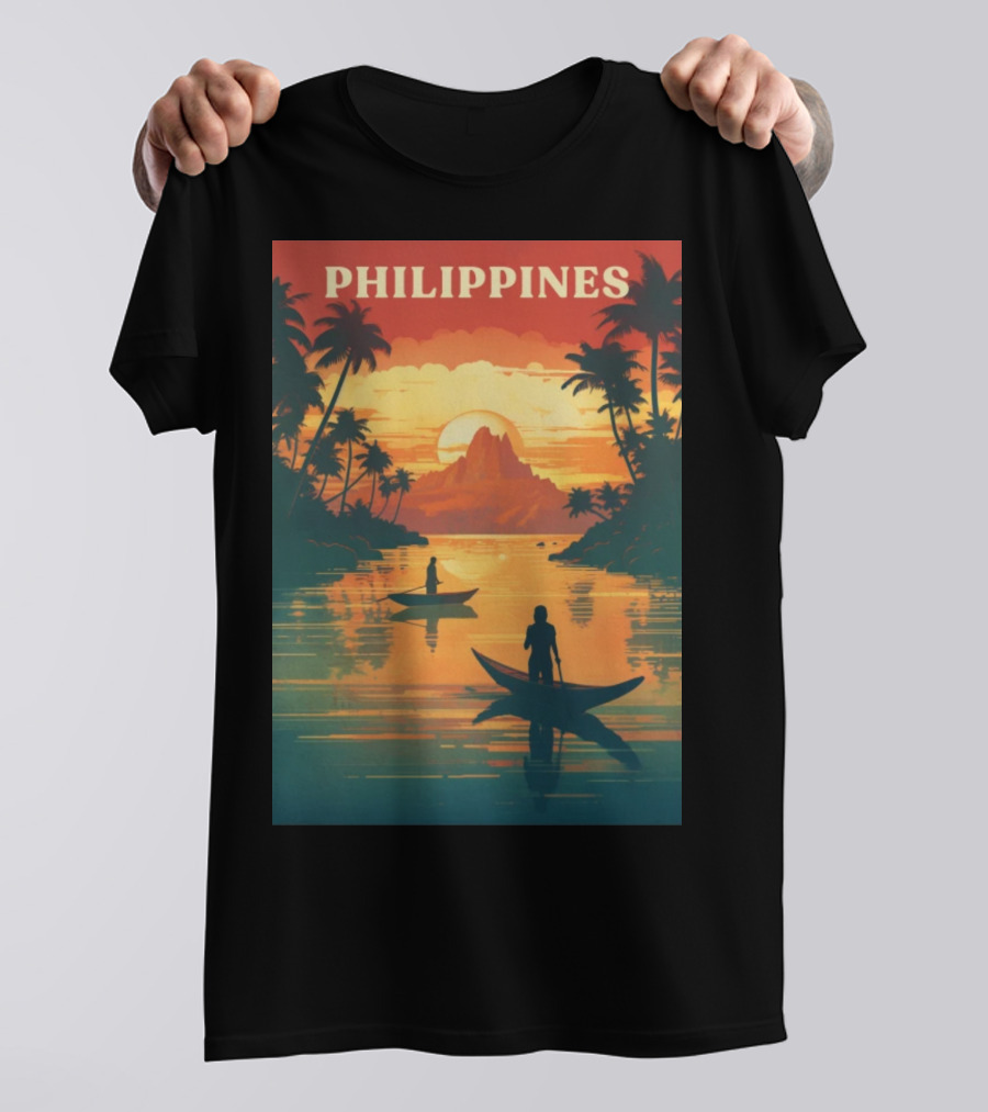Philippines Sunset Canoe Adventure Tropical Paradise Scene Shirt made from 100% pre-shrunk ring-spun cotton, unisex regular fit based on U.S. standard sizing. The shirt is designed, cut, sewn, and printed in the United States. Available in sizes S-5XL.