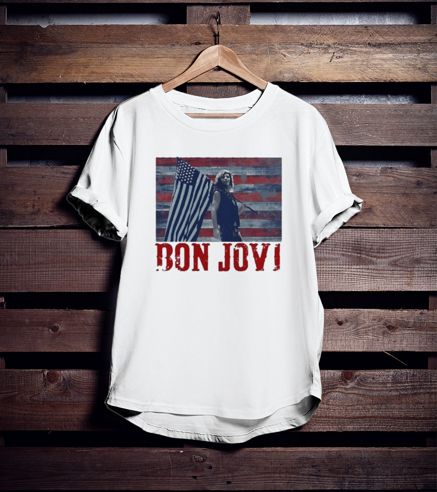 Bon Jovi American Flag Shirt made from 100% pre-shrunk ring-spun cotton, unisex regular fit based on U.S. standard sizing. The shirt is designed, cut, sewn, and printed in the United States. Available in sizes S-5XL.