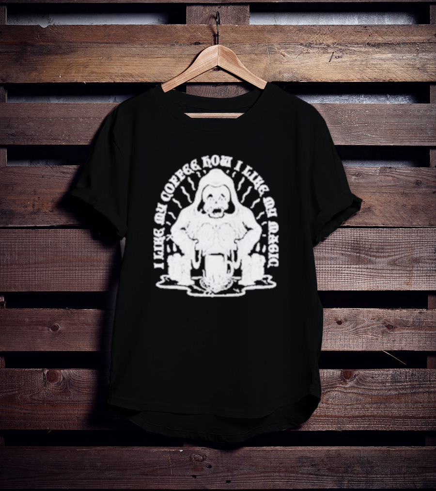 I LIKE MY COFFEE HOW I LIKE MY MAGIC Shirt made from 100% pre-shrunk ring-spun cotton, unisex regular fit based on U.S. standard sizing. The shirt is designed, cut, sewn, and printed in the United States. Available in sizes S-5XL.