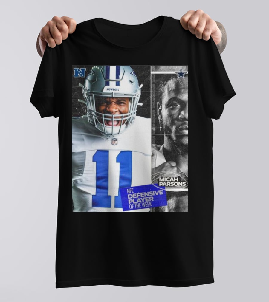 Dallas Cowboys 11 Micah Parsons NFC Defensive Player Of The Week Shirt made from 100% pre-shrunk ring-spun cotton, unisex regular fit based on U.S. standard sizing. The shirt is designed, cut, sewn, and printed in the United States. Available in sizes S-5XL.
