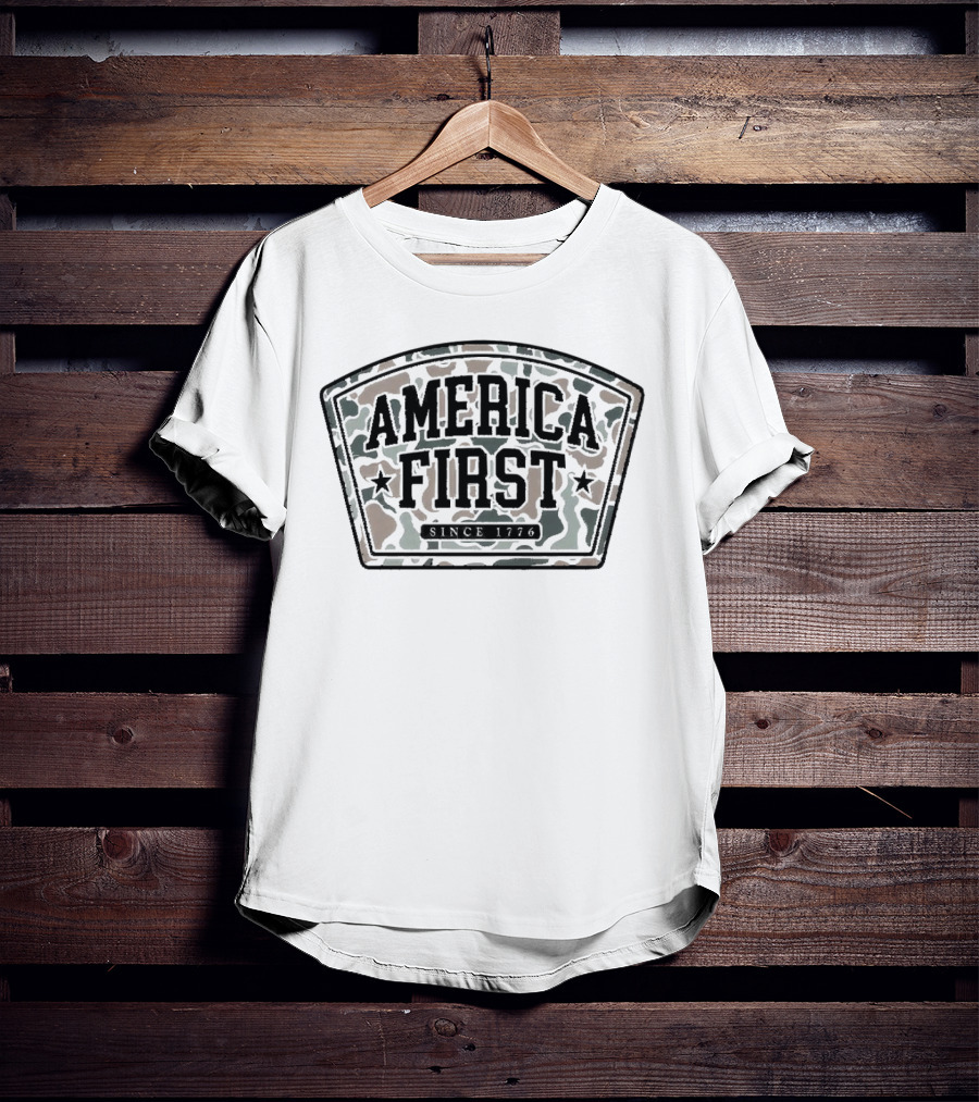 America First Camo Patch Since 1776 Shirt made from 100% pre-shrunk ring-spun cotton, unisex regular fit based on U.S. standard sizing. The shirt is designed, cut, sewn, and printed in the United States. Available in sizes S-5XL.