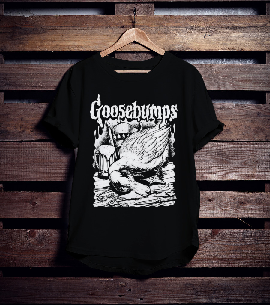 Goosebumps Goose with Thrown Chair and Mug Shirt made from 100% pre-shrunk ring-spun cotton, unisex regular fit based on U.S. standard sizing. The shirt is designed, cut, sewn, and printed in the United States. Available in sizes S-5XL.