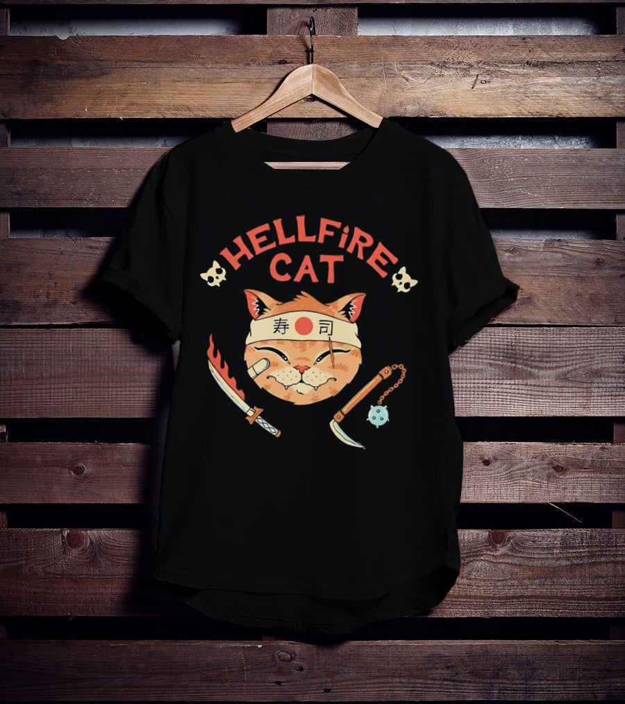 Hellfire Cat Sushi Samurai with Nunchaku and Flaming Sword Shirt made from 100% pre-shrunk ring-spun cotton, unisex regular fit based on U.S. standard sizing. The shirt is designed, cut, sewn, and printed in the United States. Available in sizes S-5XL.