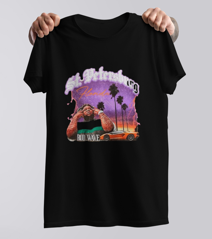 St. Petersburg Florida Rod Wave Purple Sunset Orange Car Palm Trees Shirt made from 100% pre-shrunk ring-spun cotton, unisex regular fit based on U.S. standard sizing. The shirt is designed, cut, sewn, and printed in the United States. Available in sizes S-5XL.