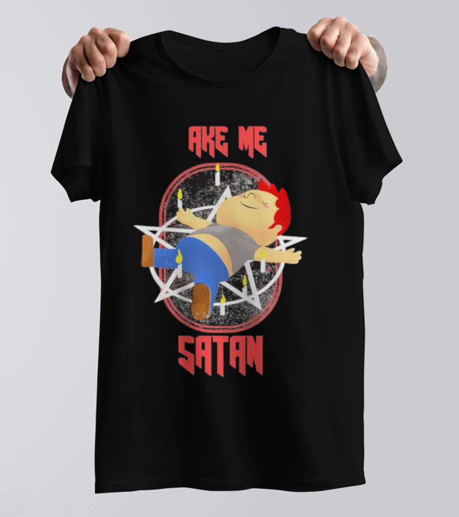 Ake Me Satan Kid Lying on Pentagram with Candles Shirt made from 100% pre-shrunk ring-spun cotton, unisex regular fit based on U.S. standard sizing. The shirt is designed, cut, sewn, and printed in the United States. Available in sizes S-5XL.