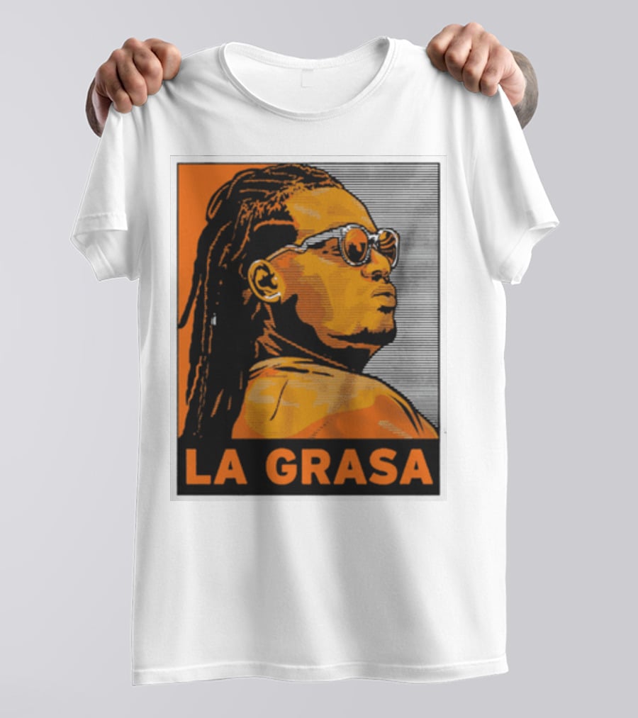 Valdez La Grasa Graphic Tee Shirt made from 100% pre-shrunk ring-spun cotton, unisex regular fit based on U.S. standard sizing. The shirt is designed, cut, sewn, and printed in the United States. Available in sizes S-5XL.