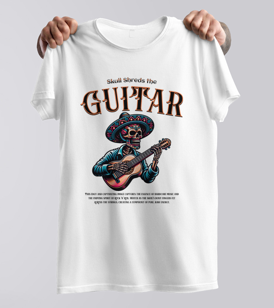 Skull Shreds the Guitar Mexico Shirt made from 100% pre-shrunk ring-spun cotton, unisex regular fit based on U.S. standard sizing. The shirt is designed, cut, sewn, and printed in the United States. Available in sizes S-5XL.