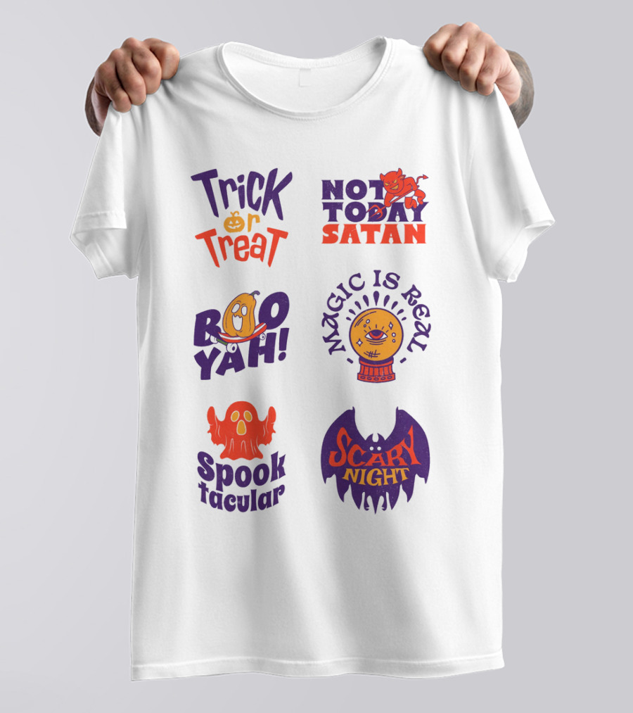Trick or Treat Not Today Satan Boo Yah Magic Is Real Spooktacular Scary Night Shirt made from 100% pre-shrunk ring-spun cotton, unisex regular fit based on U.S. standard sizing. The shirt is designed, cut, sewn, and printed in the United States. Available in sizes S-5XL.