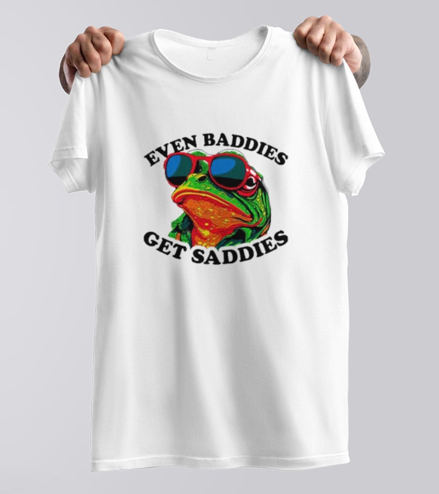 Even Baddies Get Saddies Frog Sunglasses Bright Colors Shirt made from 100% pre-shrunk ring-spun cotton, unisex regular fit based on U.S. standard sizing. The shirt is designed, cut, sewn, and printed in the United States. Available in sizes S-5XL.