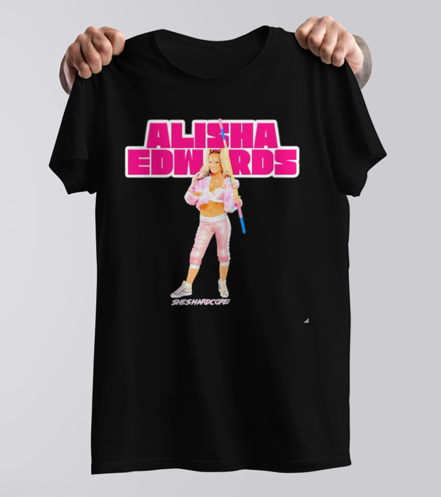 Alisha Edwards She's Hardcore Pink and White Wrestling Shirt made from 100% pre-shrunk ring-spun cotton, unisex regular fit based on U.S. standard sizing. The shirt is designed, cut, sewn, and printed in the United States. Available in sizes S-5XL.