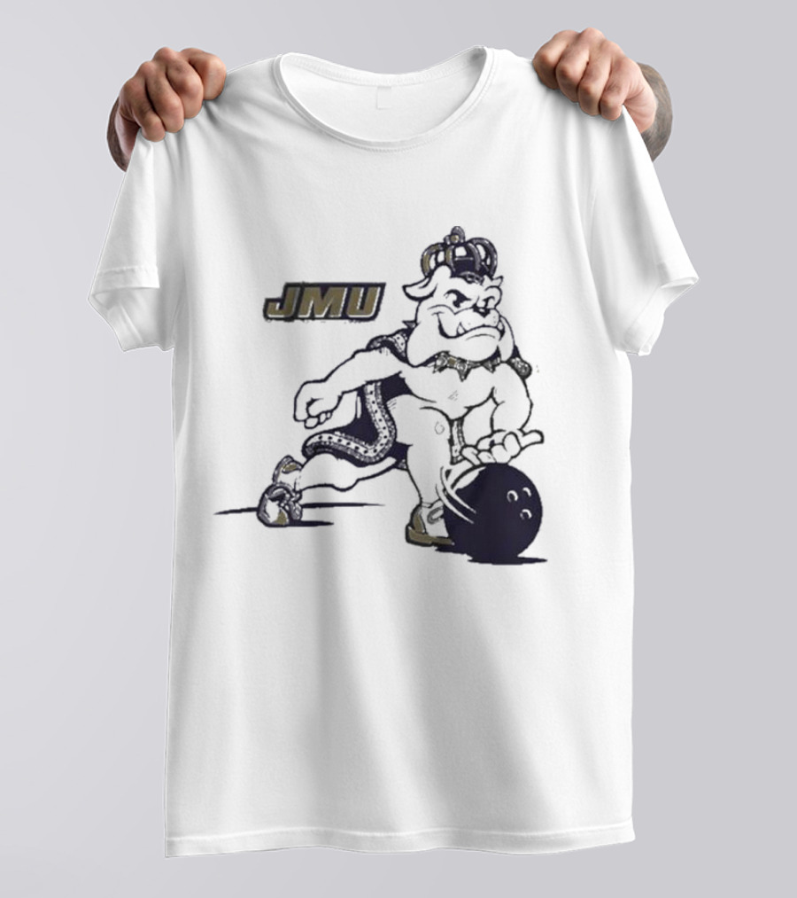 JMU Dukes Football Bowling Mascot Shirt made from 100% pre-shrunk ring-spun cotton, unisex regular fit based on U.S. standard sizing. The shirt is designed, cut, sewn, and printed in the United States. Available in sizes S-5XL.