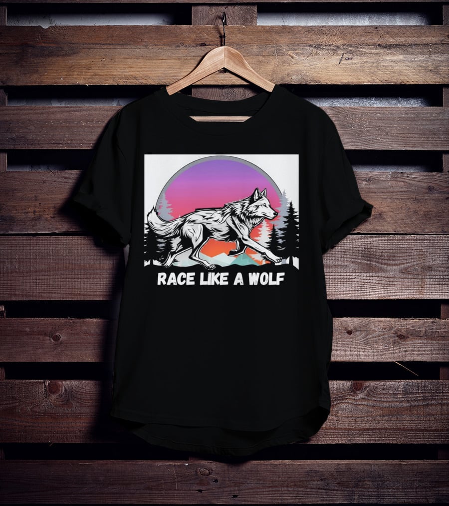Race Like a Wolf Running Through Forest Silhouette at Sunset Shirt made from 100% pre-shrunk ring-spun cotton, unisex regular fit based on U.S. standard sizing. The shirt is designed, cut, sewn, and printed in the United States. Available in sizes S-5XL.