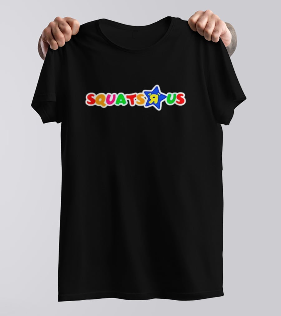 Squats R Us Colorful Star Emblem Shirt made from 100% pre-shrunk ring-spun cotton, unisex regular fit based on U.S. standard sizing. The shirt is designed, cut, sewn, and printed in the United States. Available in sizes S-5XL.