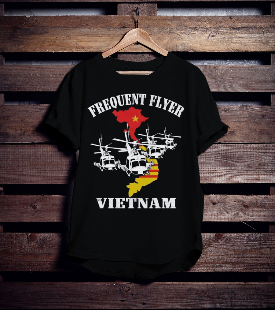 Frequent Flyer Helicopter Vietnam Map with Star and Stripes Shirt made from 100% pre-shrunk ring-spun cotton, unisex regular fit based on U.S. standard sizing. The shirt is designed, cut, sewn, and printed in the United States. Available in sizes S-5XL.