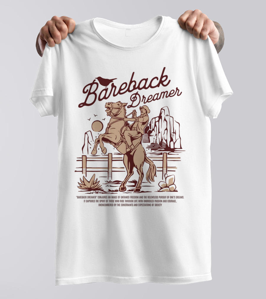 Bareback Dreamer Embracing Freedom and Courage on the Open Range Shirt made from 100% pre-shrunk ring-spun cotton, unisex regular fit based on U.S. standard sizing. The shirt is designed, cut, sewn, and printed in the United States. Available in sizes S-5XL.