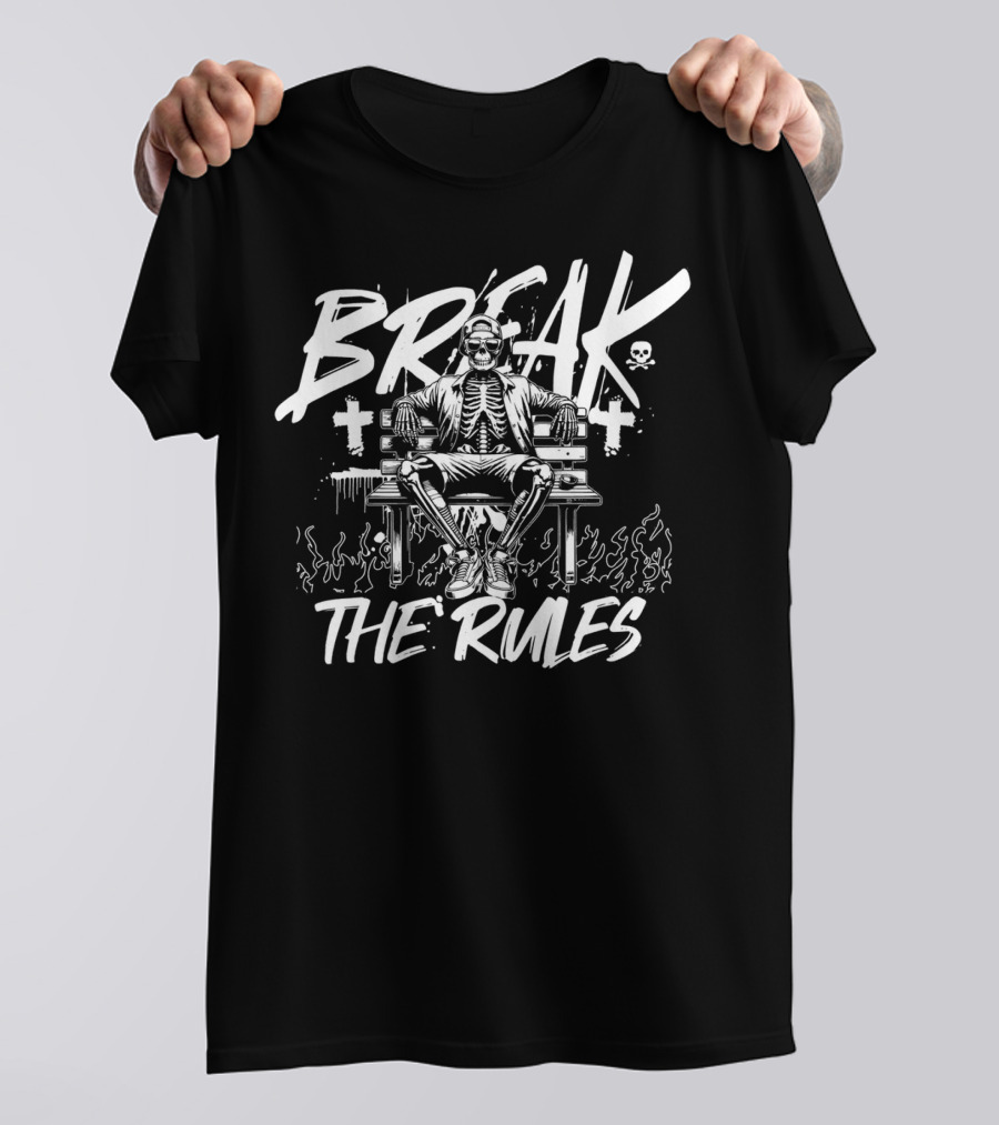 BREAK THE RULES Skeleton Bench Fire Skulls Crosses T-Shirt