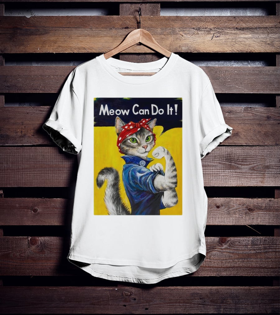 Meow Can Do It Rosie The Riveter Cat Red Bandana Shirt made from 100% pre-shrunk ring-spun cotton, unisex regular fit based on U.S. standard sizing. The shirt is designed, cut, sewn, and printed in the United States. Available in sizes S-5XL.