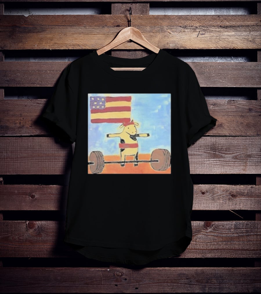 Lean Beef Patty American Flag Deadlifting Cow Shirt made from 100% pre-shrunk ring-spun cotton, unisex regular fit based on U.S. standard sizing. The shirt is designed, cut, sewn, and printed in the United States. Available in sizes S-5XL.
