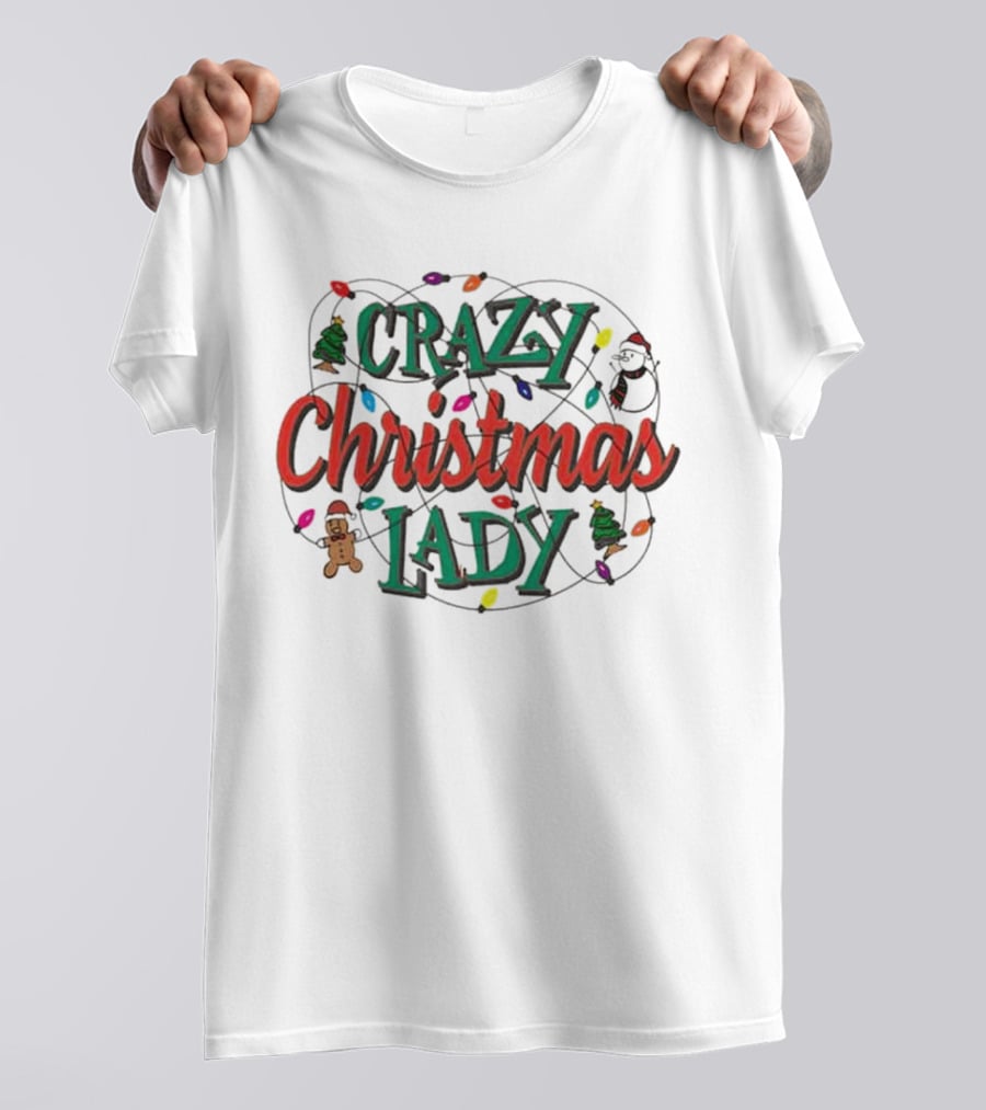 Crazy Christmas Lady Lights Gingerbread Tree Stocking Shirt made from 100% pre-shrunk ring-spun cotton, unisex regular fit based on U.S. standard sizing. The shirt is designed, cut, sewn, and printed in the United States. Available in sizes S-5XL.