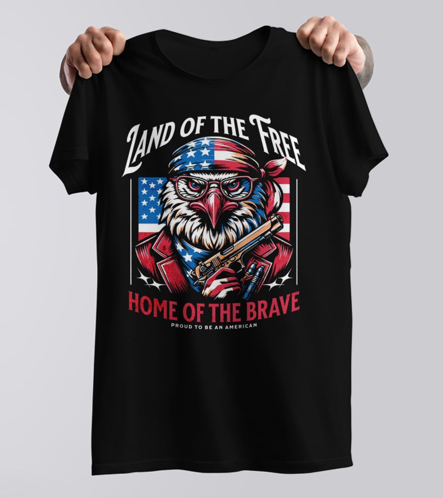 Land of the Free Home of the Brave Proud to Be an American Eagle with Bandana and Gun Shirt made from 100% pre-shrunk ring-spun cotton, unisex regular fit based on U.S. standard sizing. The shirt is designed, cut, sewn, and printed in the United States. Available in sizes S-5XL.