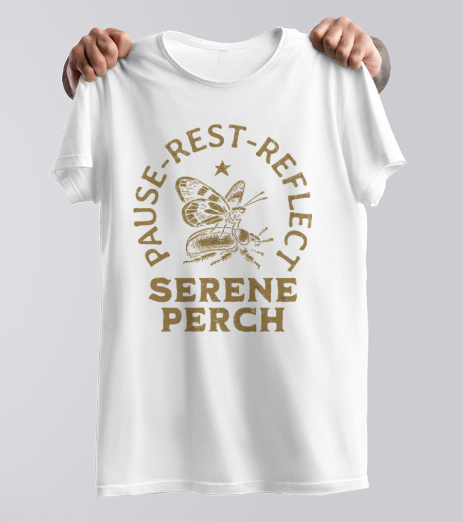 Pause Rest Reflect Serene Perch Butterfly and Star Shirt made from 100% pre-shrunk ring-spun cotton, unisex regular fit based on U.S. standard sizing. The shirt is designed, cut, sewn, and printed in the United States. Available in sizes S-5XL.