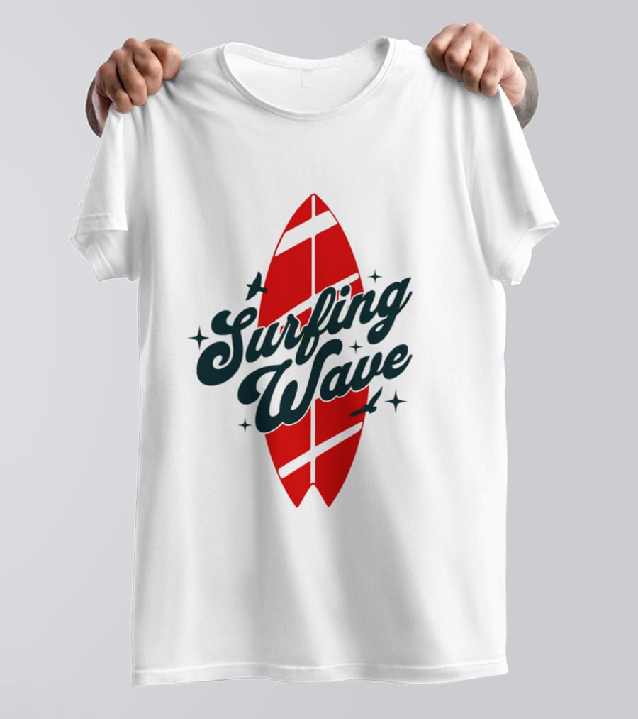 Surfing Wave Red Surfboard Shirt made from 100% pre-shrunk ring-spun cotton, unisex regular fit based on U.S. standard sizing. The shirt is designed, cut, sewn, and printed in the United States. Available in sizes S-5XL.