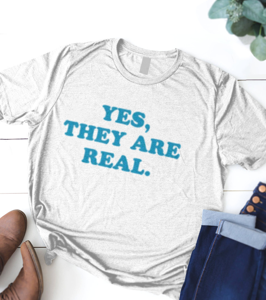 Mitchell Yes They Are Real Bold Blue Text Shirt made from 100% pre-shrunk ring-spun cotton, unisex regular fit based on U.S. standard sizing. The shirt is designed, cut, sewn, and printed in the United States. Available in sizes S-5XL.