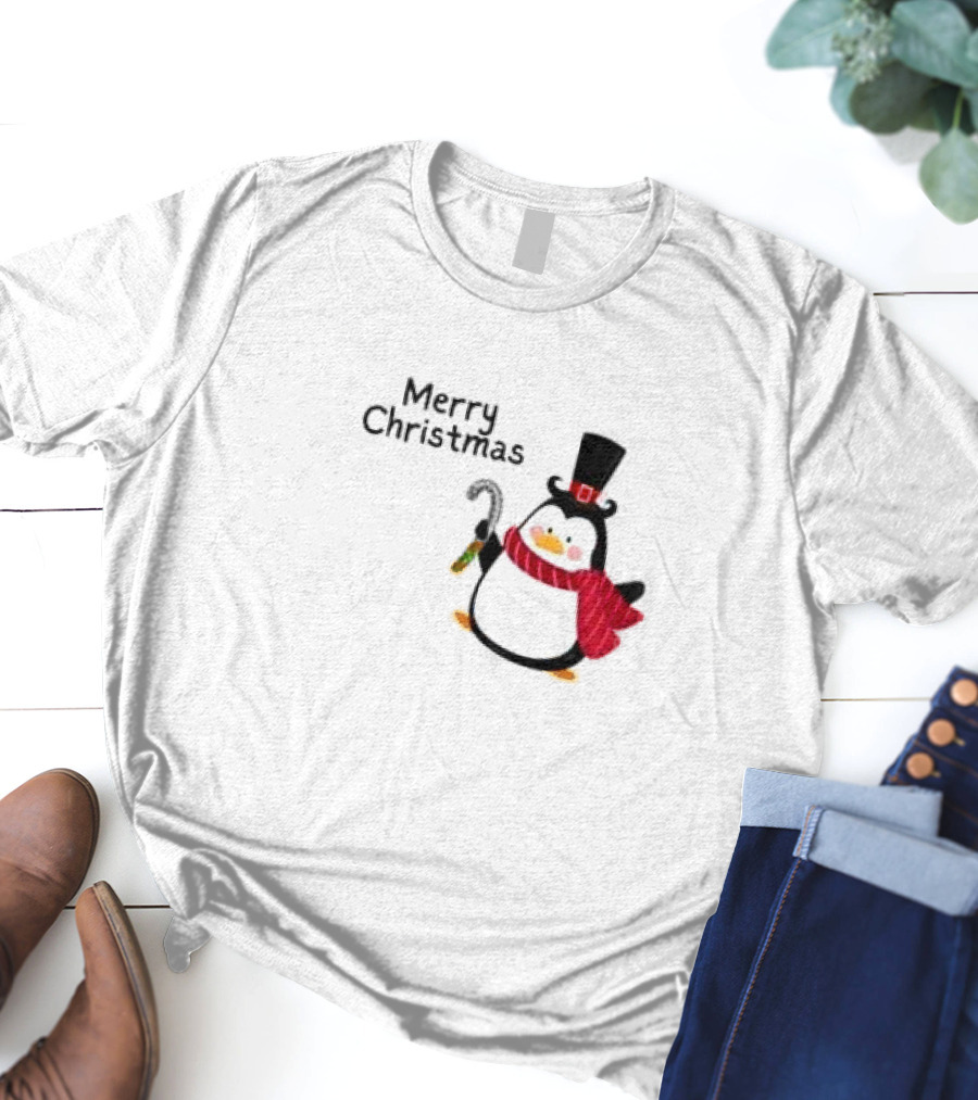 Merry Christmas Penguin with Candy Cane and Top Hat Shirt made from 100% pre-shrunk ring-spun cotton, unisex regular fit based on U.S. standard sizing. The shirt is designed, cut, sewn, and printed in the United States. Available in sizes S-5XL.