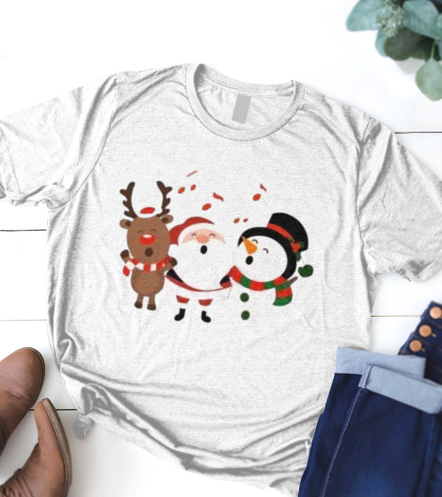 Santa Reindeer And Snowman Singing Christmas Carols Together T-Shirt