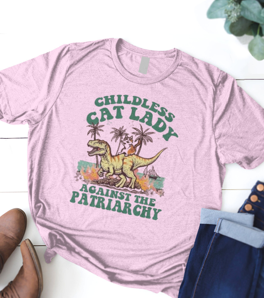 Childless Cat Lady Riding Dinosaur Against the Patriarchy with Flaming Coconut Trees Shirt made from 100% pre-shrunk ring-spun cotton, unisex regular fit based on U.S. standard sizing. The shirt is designed, cut, sewn, and printed in the United States. Available in sizes S-5XL.