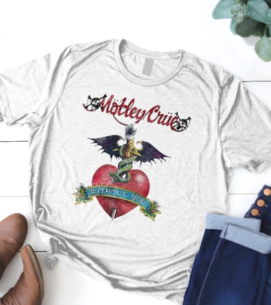 Motley Crue Dr Feelgood Album Without You Heart and Snake Shirt made from 100% pre-shrunk ring-spun cotton, unisex regular fit based on U.S. standard sizing. The shirt is designed, cut, sewn, and printed in the United States. Available in sizes S-5XL.