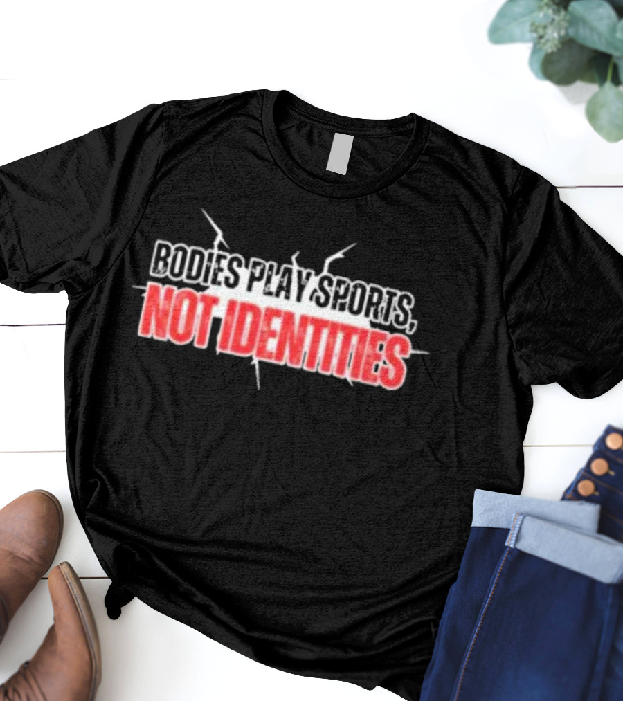 Bodies Play Sports Not Identities Shirt made from 100% pre-shrunk ring-spun cotton, unisex regular fit based on U.S. standard sizing. The shirt is designed, cut, sewn, and printed in the United States. Available in sizes S-5XL.