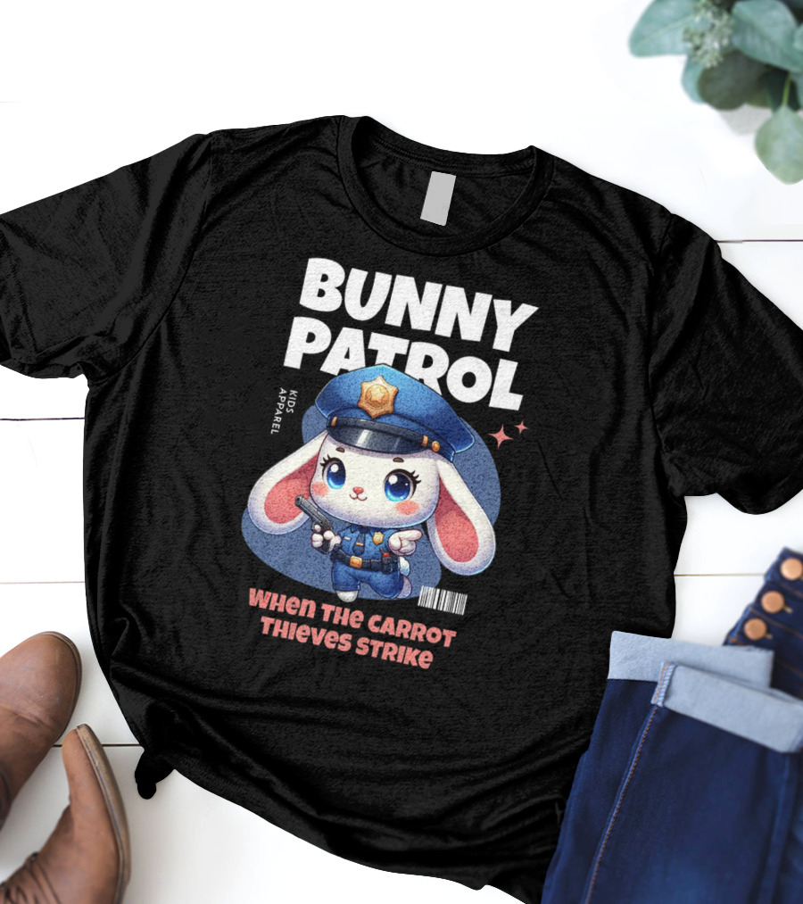 Bunny Patrol Kids Apparel When the Carrot Thieves Strike Shirt made from 100% pre-shrunk ring-spun cotton, unisex regular fit based on U.S. standard sizing. The shirt is designed, cut, sewn, and printed in the United States. Available in sizes S-5XL.